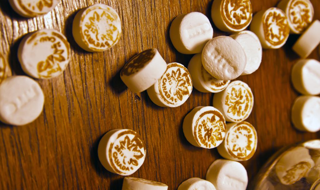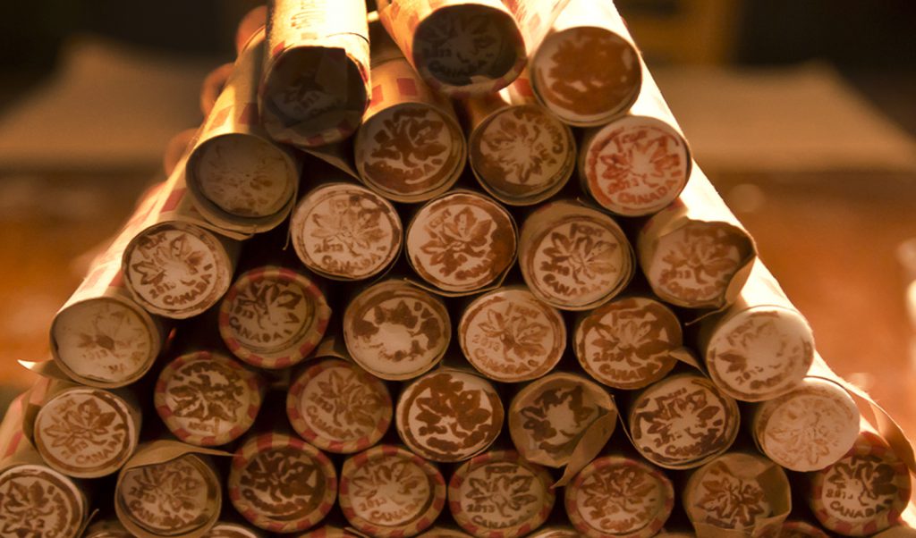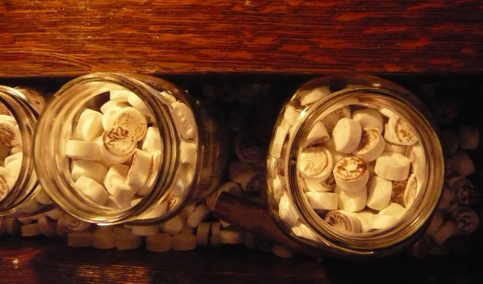Ghost pennies (300 pounds of scotch mints hand-stamped with the image of a 2013 Canadian penny) spill across the marble top of a substantial, antique, candy -come-banking counter where overflowing penny jars abound, celebrating the spirit of the penny as well as the happy memory of penny candy that so many of us remember with such pleasure. Penny-mints to savour and enjoy, until like the real penny…. they melt and fade away.