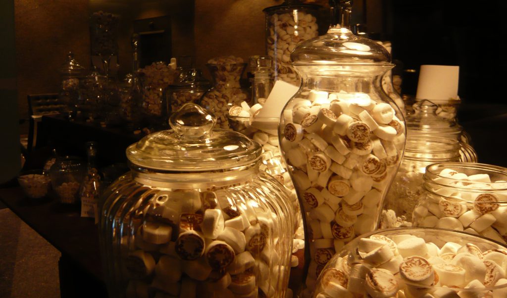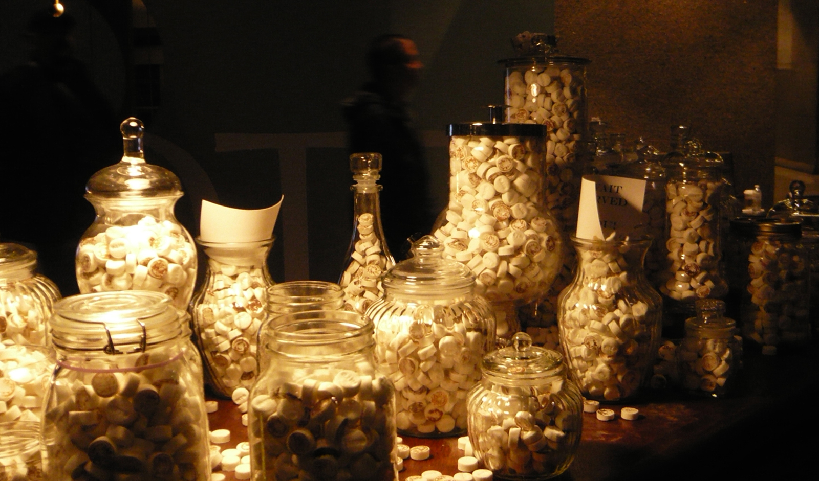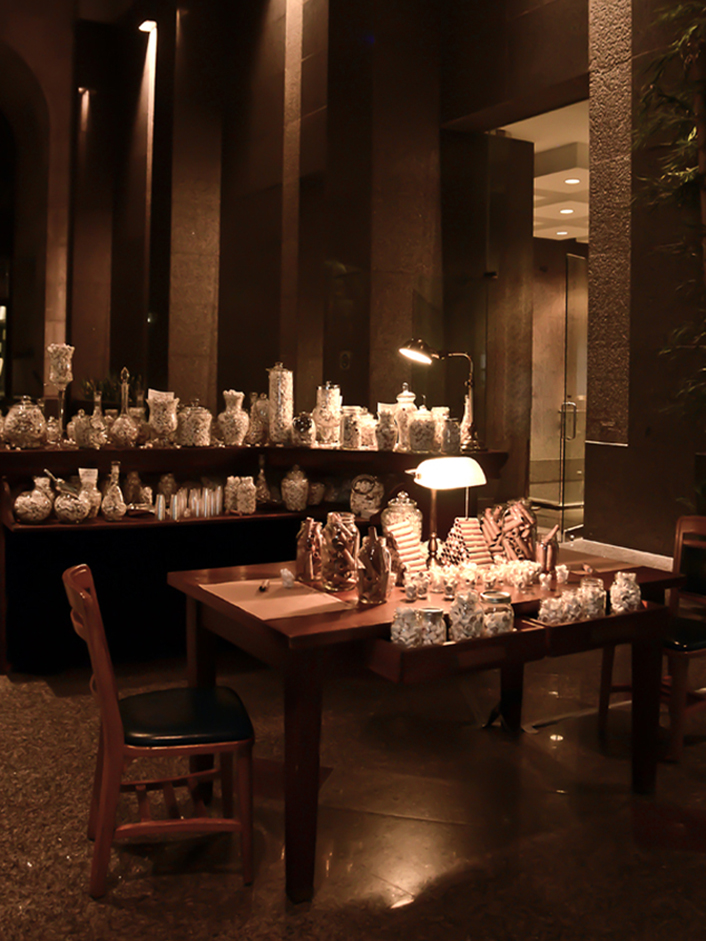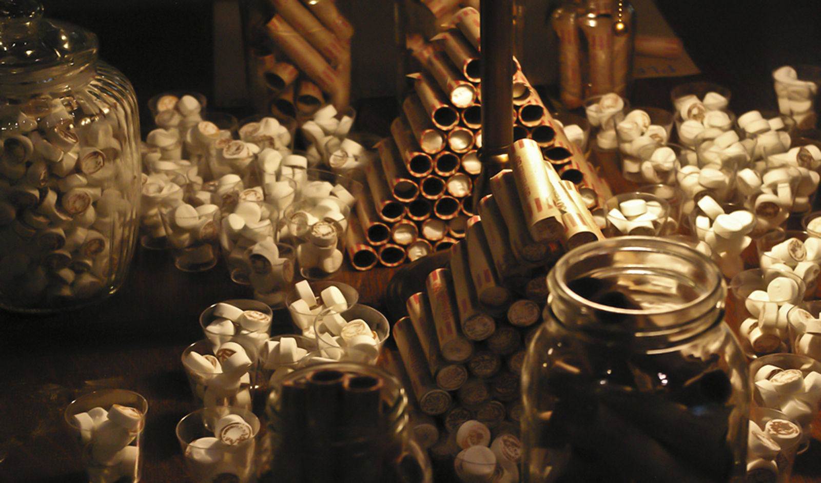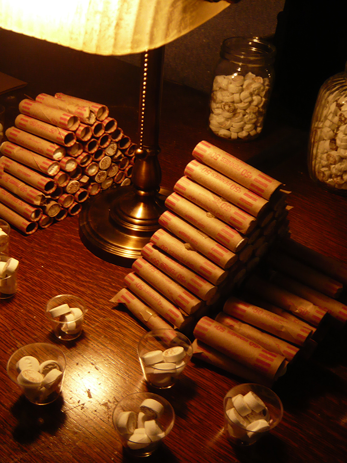 Site-responsive installation with 300 lbs of scotch mints, glass jars, coin rollers, oak table and chairs, bar.