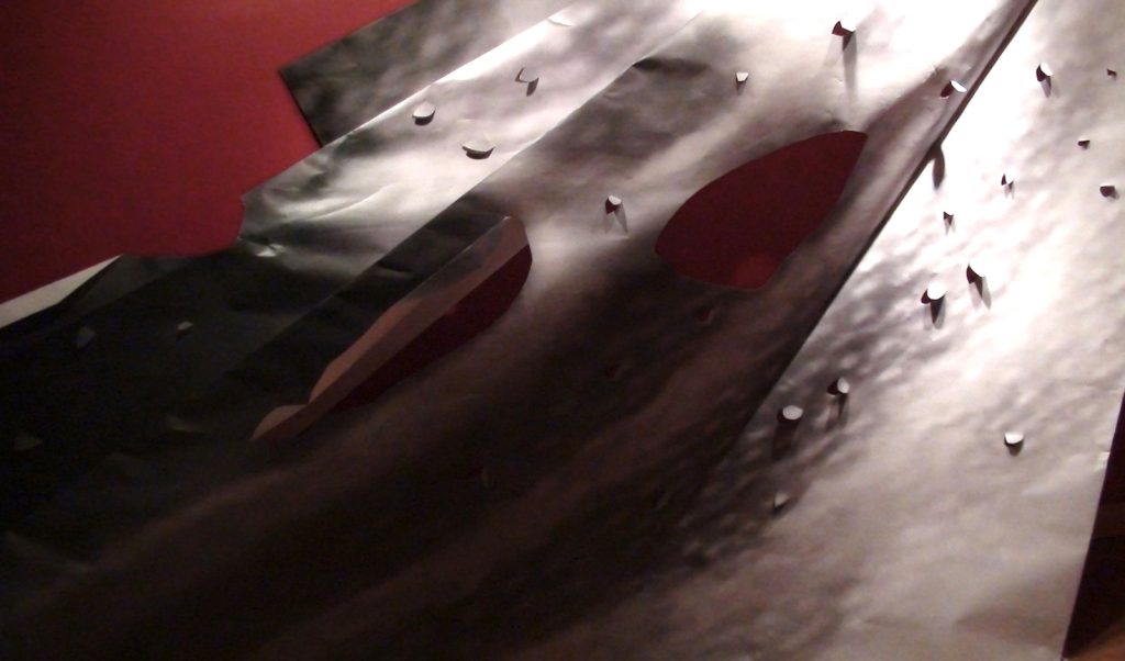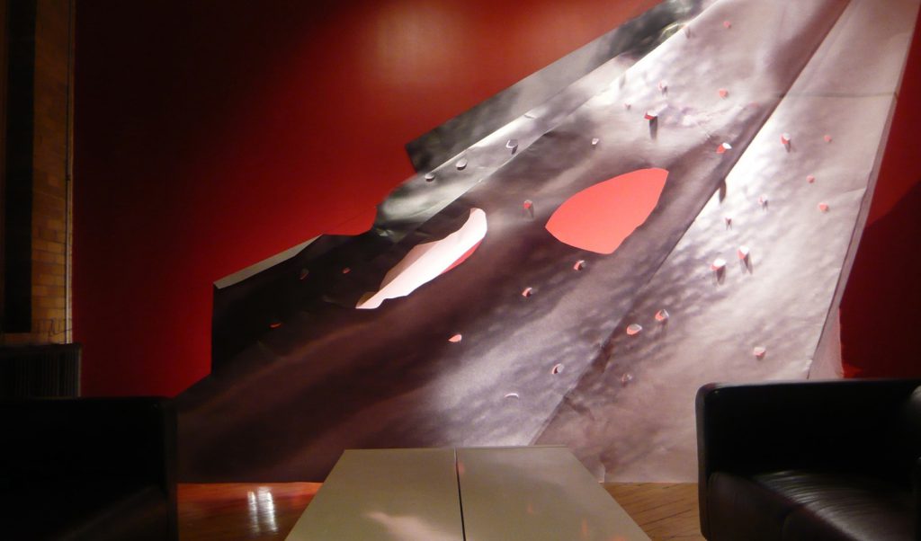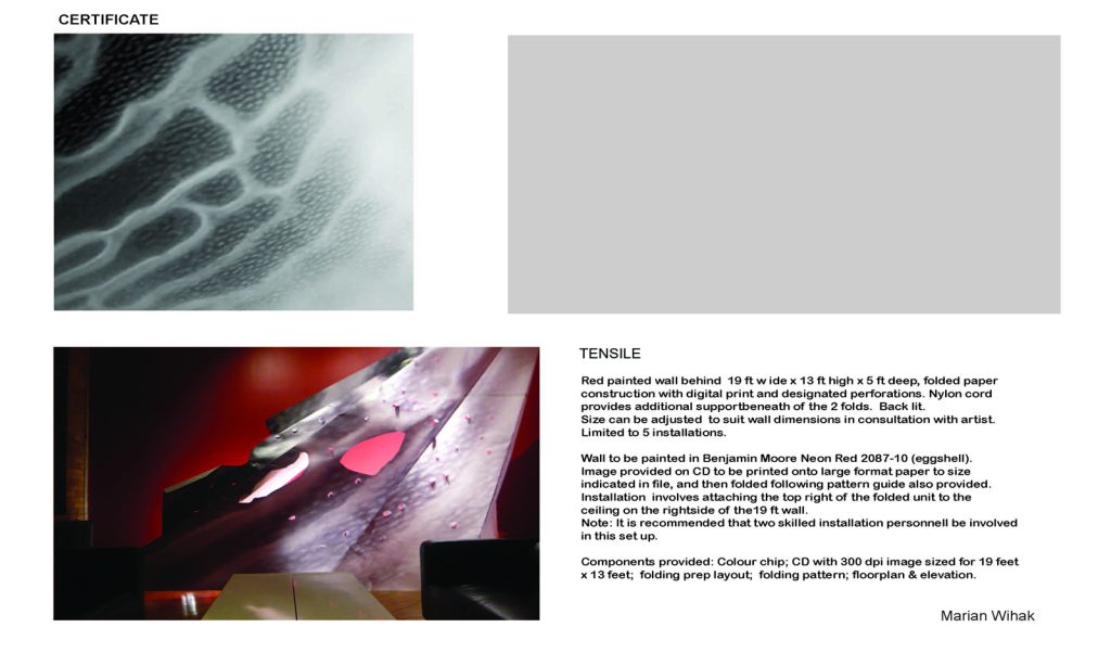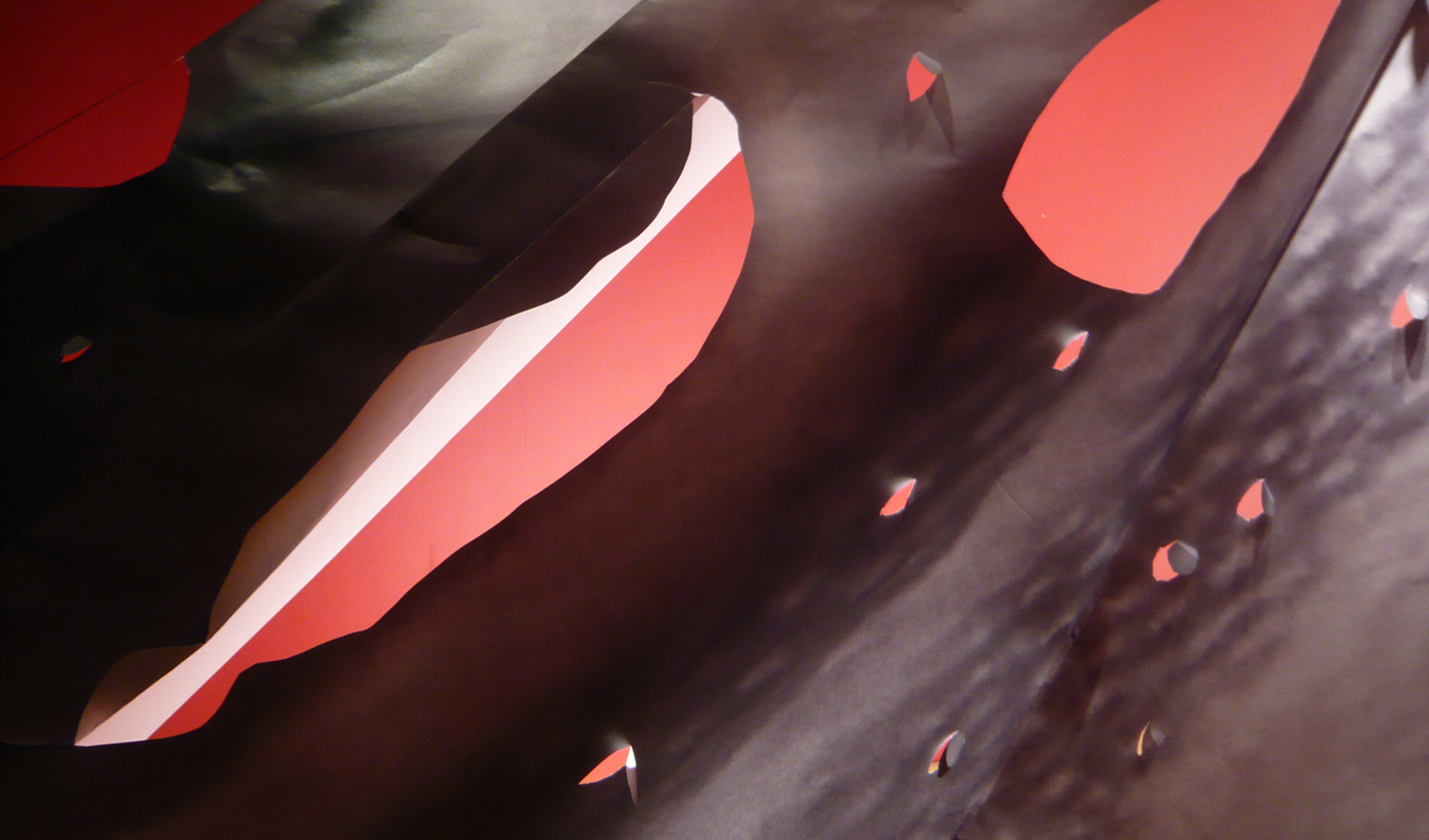 This iteration of Tensile was installed for a few month into the lobby of 401 Richmond St. West in Toronto, a heritage building with a lively, creative community of businesses and artists comprising both tenants and visitors. In an area primarily used as a waiting, resting or lunching place – in other words a static environment – I want the installation to emanate both movement and transition. I also want to engage the viewer in a game of perception whereby they partially recognize what they are seeing, and are partially confounded by it. I want to create a sense of push-pull generated between negative and positive space with the saturated red wall pulsing through the tears and the gaping wounds rendered into the folded structure. The suggestion is that this is an ambiguously organic and biological entity presenting a dynamic, energetic force within an otherwise static space, thus prompting engagement and a closer look.