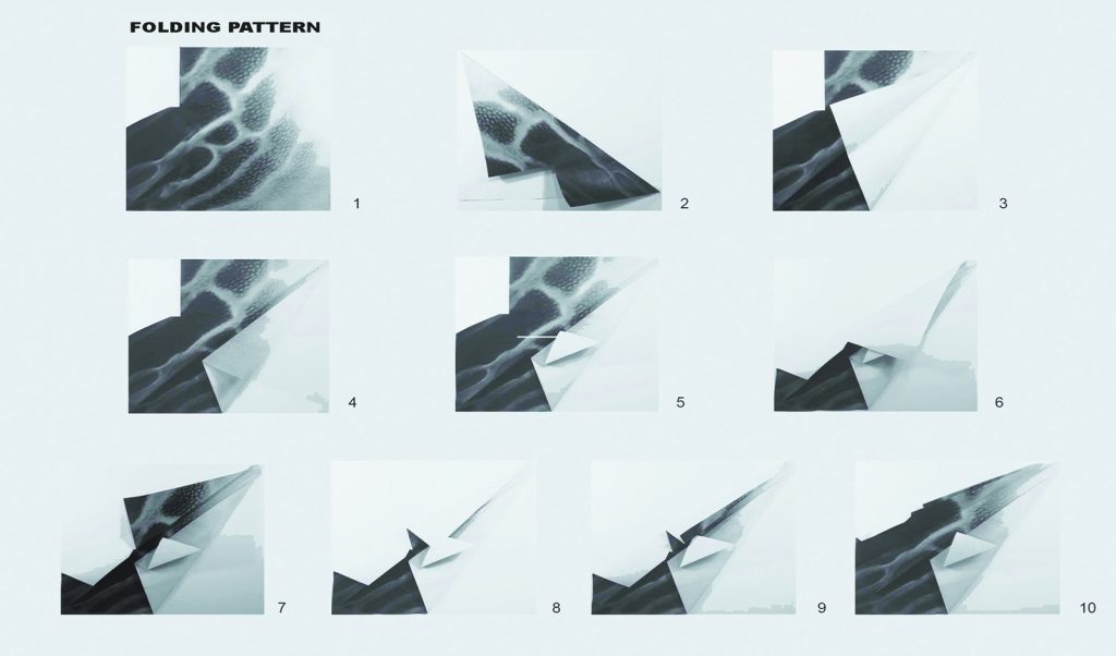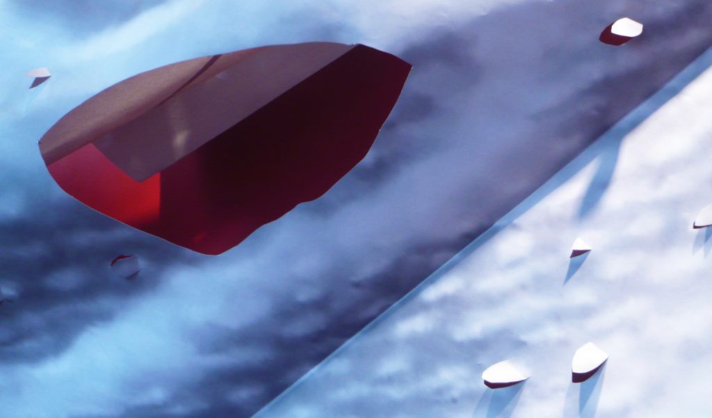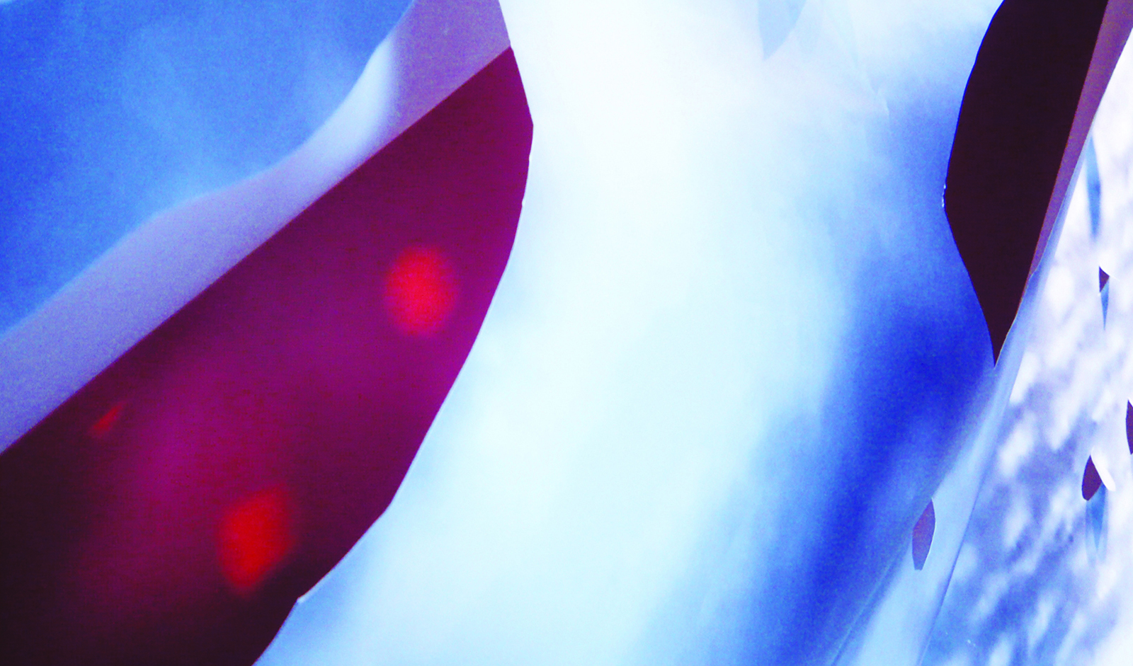 Having for years mined Prussian and indigo blue within my painting practice, in Tensile I make an about-face and embrace bright red, vibrant red, dramatic red, passionate red, un-gentle red. By using this colour, it is my intent to bring to mind flesh in its glow, corporal pulse in its depth, blood in the veins. In front of a large wall painted an intense shade of red (Benjamin Moore’s Neon Red 2087-10 – eggshell), I pin a large origami like folded swath of seamless paper, which cascades diagonally downwards from a high point on the right. The paper is digitally printed with the exploded view of a microscopic section of a moon jellyfish, and the surface of the paper takes on the ‘appearance of skin, porous and pitted, effervescent and shadowy, veined and torn. The bottom of the folded paper splays across and outwards from the base of the wall, allowing the folds to create cavities and cavernous hollows, and allowing the tears and perforations to reveal the red wall behind. A light is hidden in the lower left fold, reflecting upwards to create a dance of light and shadow in relation to the variably sized tears in the material. The light also causes the red wall to reflect onto the back of the material, creating a soft, glowing blush.
