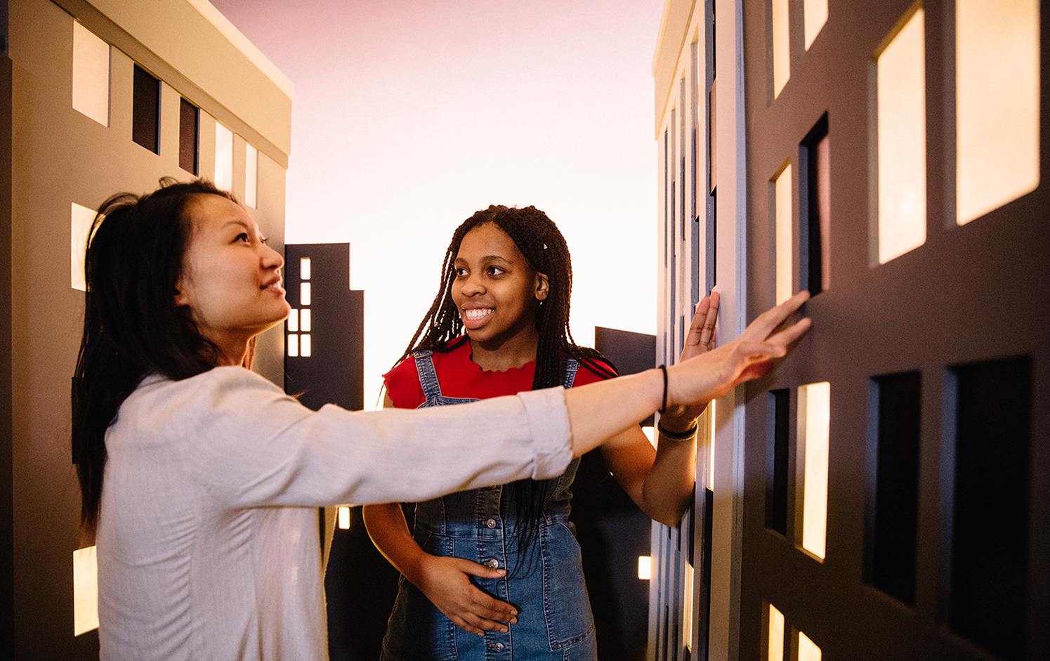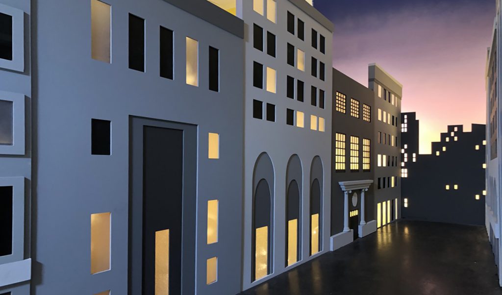 The goal was to make our 3-D poster photo-op friendly, discoverable and visually striking as well as immersive, experiential, and encouraging for visitors to enter into the poster itself. I designed the installation to reference and evoke qualities and tactics found in traditional film set design, and in turn used forced perspective and scale to help tease out a narrative tableau, with the participant visitors as the central cast. We felt that using a black and white movie grey-scale, with a cinemascope sunset on the horizon, also lent to the texture of a classic film narrative.