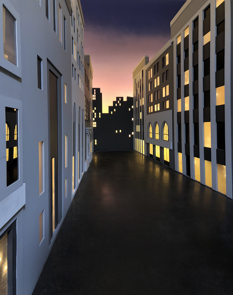 In line with the personal installations I have been making since around 2013, I also wanted to engage the visitors in a phenomenological, perceptual experience layered with both pleasure and disorientation; the ramping path with the forced perspective buildings flanking either side provided this result physically, with the surprising perceptual bonus of sound that echoed and bounced between the architecture.